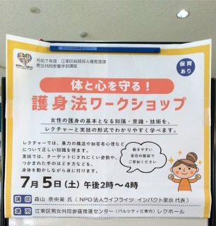 7月5日、江東区男女共同参画推進センターで「体と心を守る! 護身法ワークショップ」を実施しました。 護身の知識と体験が、自身の力となることを願っています。 皆さん暑い中ご参加ありがとうございました